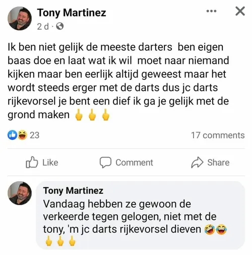 "Eine Diebesbande'', so beschrieb Martinez die Organisation des Turniers. Das Turnier wurde von JC Darts organisiert. "Es wird immer schlimmer und schlimmer mit den Darts, also jc darts Rijkevorsel du bist ein Dieb, ich werde dich zu Boden bringen", schrieb Martinez.