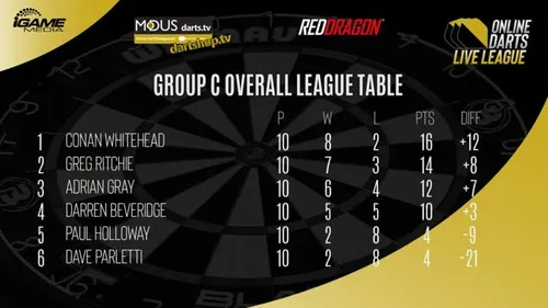 Whitehead gewann am Freitag vier weitere Spiele, nachdem er Adrian Gray (4-3), Paul Holloway (4-2), Dave Parletti (4-1) und Darren Beveridge (4-3) besiegt hatte. The Barbarian sicherte sich mit vier Siegen am Donnerstag den ersten Platz in dieser Gruppe.