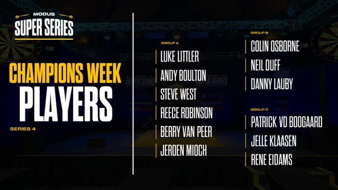 Die sechs Wochensieger mit dem höchsten Wochenaverage starten in Gruppe A. Dies sind Littler, Boulton, West, Robinson, van Peer und Mioch. Sie werden bis Mittwoch täglich gegeneinander spielen. Der Sieger dieser Gruppe zieht automatisch in die Finalrunde am Samstag ein.