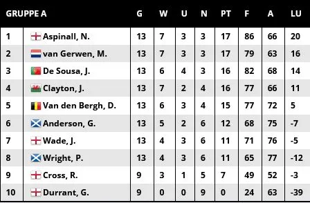 Aspinall hat mit siebzehn Punkten die gleiche Anzahl an Punkten wie van Gerwen, aber die Legdifferenz beträgt vier Legs zu Gunsten des Engländers.