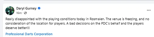 "Ich bin wirklich enttäuscht über die Spielbedingungen heute in Rosmalen. Der Austragungsort ist eiskalt und es wurde keinerlei Rücksicht auf die Spieler genommen. Eine schlechte Entscheidung der PDC und die Spieler haben etwas Besseres verdient!!!"