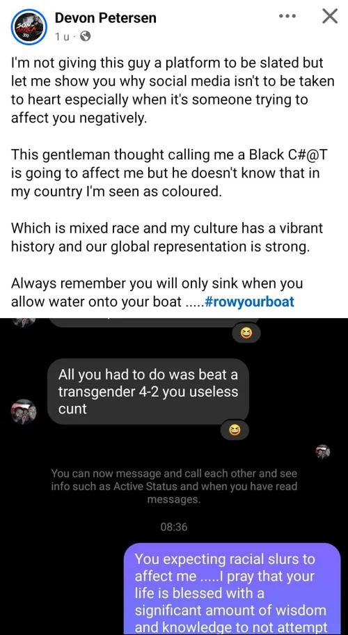Devon Petersen hatte eine böse Nachricht auf seinem Telefon erhalten, nachdem er am Freitagmorgen sein Handy geöffnet hatte. Der Südafrikaner teilte die eingehenden Flüche in einem Screenshot auf seinen sozialen Medien.