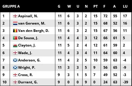 Nathan Aspinall hat. The Asp verschenkte seine Zwei-Punkte-Führung durch die Niederlage gegen die Nummer drei Dimitri van Bergh. Der Belgier hat nun ebenfalls fünfzehn Punkte aus elf Spielen.