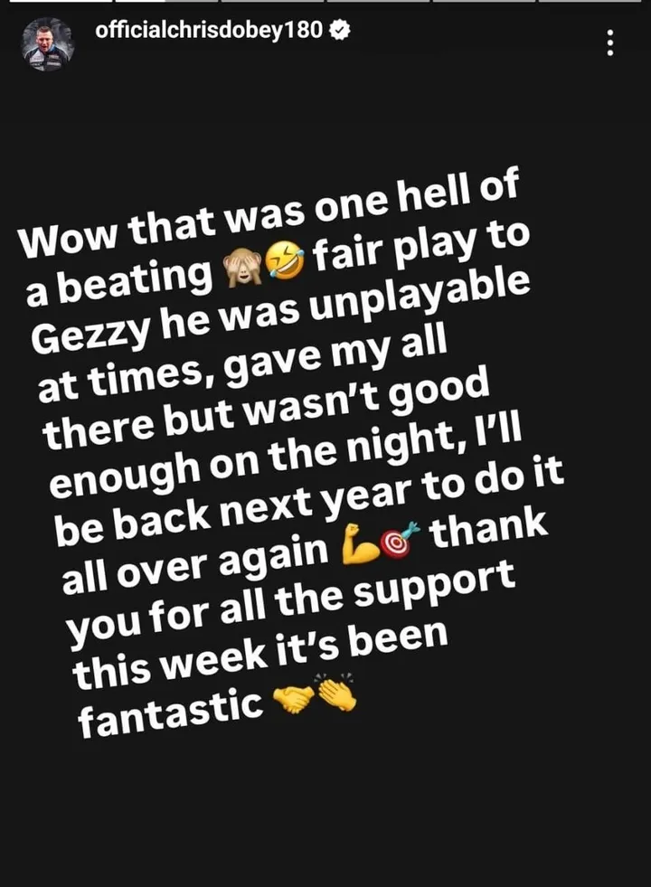 "Wow, das war eine harte Niederlage. Fair play to Gezzy, er war zeitweise nicht zu stoppen", schrieb ein sportlicher Dobey auf seinen Instagram Stories. Der Engländer konnte sich nicht viel vorwerfen. ''Ich habe alles gegeben, aber heute Abend war ich einfach nicht gut genug. Ich werde nächstes Jahr wiederkommen und es erneut versuchen. Danke für die ganze Unterstützung in dieser Woche, es war fantastisch!'', schloss Dobey.