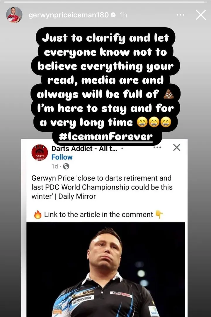 Sie nutzten auch frühere Zitate von Price in einem Interview mit Online Darts, in dem er sagte, dass er den Dartsport nicht mehr an die erste Stelle setzen würde, da sie auf einen möglichen Rücktritt warten.