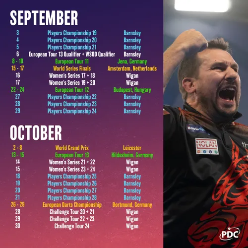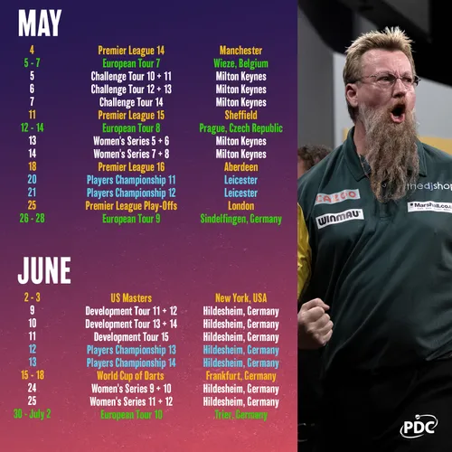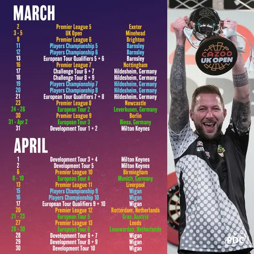 UK Open finden vom 3. bis 5. März im Butlin's Minehead Resort statt. Frankfurt wird vom 15. bis 18. Juni Schauplatz des