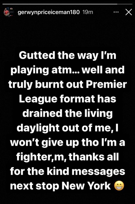Nach dem Match sagte Price auf Instagram, dass er im Moment nur noch wenig Energie hat. "Ich bin enttäuscht, wie ich im Moment spiele. Das Format der Premier League hat dazu geführt, dass ich völlig ausgebrannt bin".