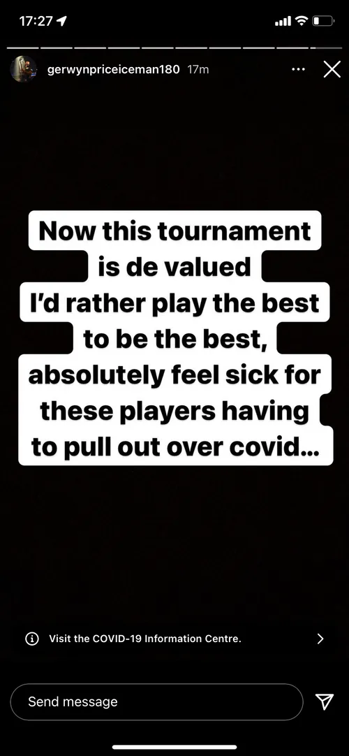 Der amtierende Weltmeister Price ist über den unerwarteten Abgang von van Gerwen überhaupt nicht glücklich. "Das Turnier ist jetzt entwertet", schreibt der Waliser auf Instagram.