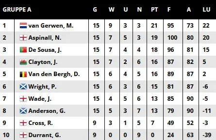De Sousa liegt auf Platz drei, aber ein zweiter Platz ist das Beste, was der Portugiese erreichen kann. Wie Van Gerwen und Aspinall ist ihm die Teilnahme an den Playoffs bereits sicher.