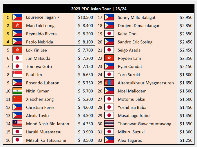 Am Sonntag findet das letzte Turnier der Saison statt. Die vier Erstplatzierten der Endrangliste erhalten eine Einladung zur Darts WM. Ilagan kann eine Platzierung nicht mehr entgehen. Man Lok Leung, Reynaldo Rivera und Paolo Nebrida komplettieren derzeit die Top Vier. Lok Yin Lee, Jun Matsuda, Tomoya Goto und Pau Lim haben ebenfalls noch die Chance, sich für die Darts Weltmeisterschaft zu qualifizieren.