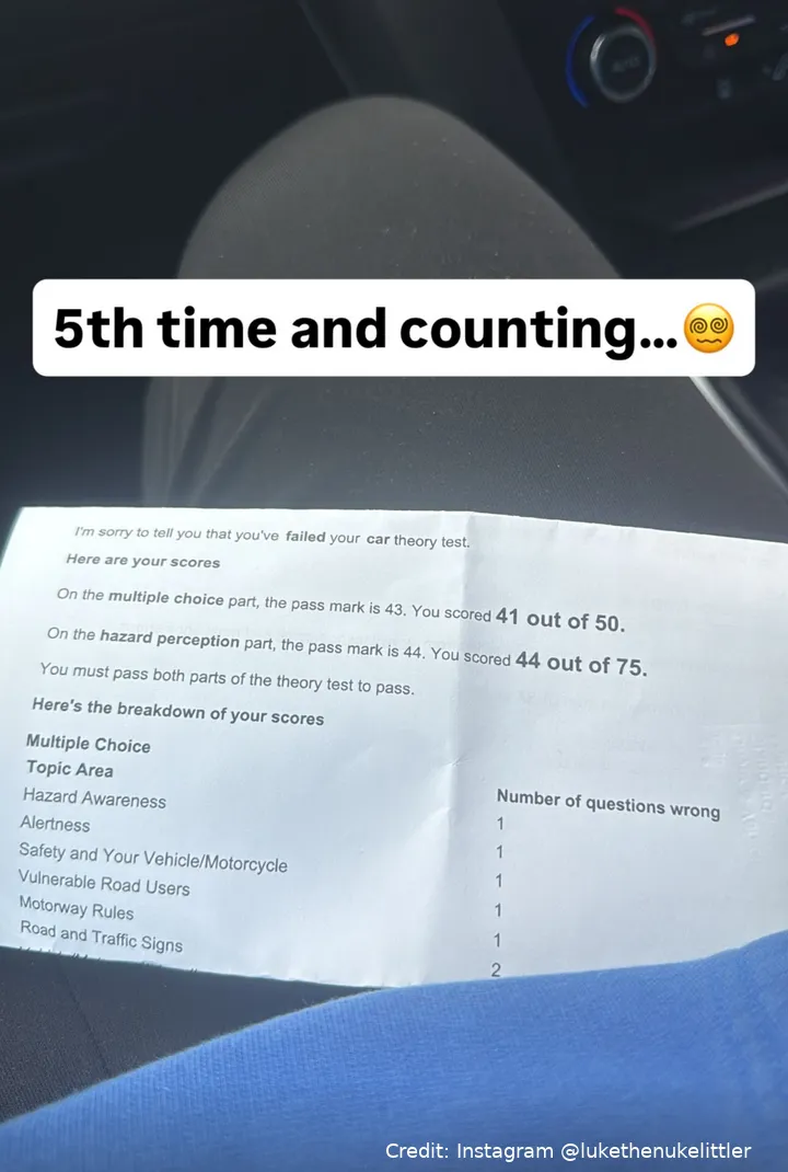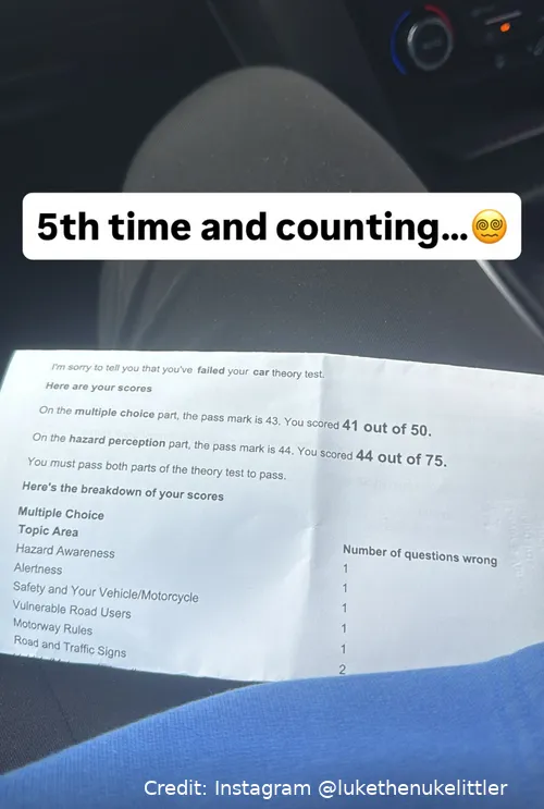 Wie Littler nun selbst auf Instagram verriet, ist er zum fünften Mal durch die theoretische Führerscheinprüfung gefallen. „Fünftes Mal und durchgefallen“, kommentierte er trocken unter einem Bild seiner Ergebnisse. Dabei fehlte ihm nicht viel – aber eben doch zu viel.