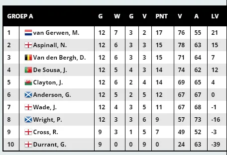 Van den Bergh hatte eine starke Begegnung mit Anderson, der im Rennen um die Play-off-Plätze bleibt. Der Flying Scotsman ist nun Sechster mit zwölf Punkten, zwei Punkte hinter De Sousa und Clayton. Wade folgt auf dem siebten Platz mit elf Punkten, gefolgt von Peter Wright mit neun Punkten.