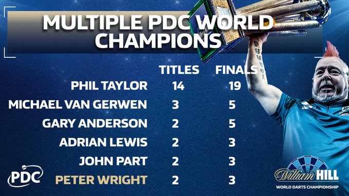 Der Spitzenreiter bei der PDC Darts Weltmeisterschaften ist natürlich Phil Taylor, der vierzehn Titel gewonnen hat. Michael van Gerwen hat bereits drei gewonnen. Neben Wright haben auch Gary Anderson, Adrian Lewis und John Part die Weltmeisterschaft zweimal gewonnen.
