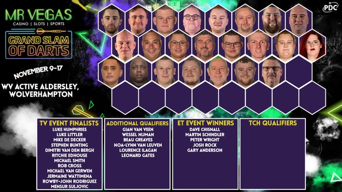 Es gibt 12 Spieler, die sich über ein im Fernsehen übertragenes Finale für den Grand Slam of Darts qualifiziert haben. Neben Edhouse und Wattimena sind dies Luke Humphries, Luke Littler, Mike De Decker, Stephen Bunting, Dimitri Van den Bergh, Michael Smith, Rob Cross, Michael van Gerwen,
