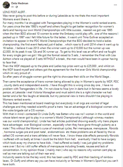 Deta Hedman hat sich in einer ausführlichen Erklärung auf Facebook gegen die Teilnahme von Transgender-Spielern an Frauen-Ranglistenturnieren ausgesprochen. Sie ist der Meinung, dass dadurch keine gleichen Bedingungen mehr geschaffen werden.