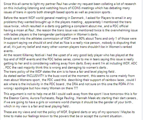 Letzte Woche erschien ein Artikel auf Dartsnews.de, in dem berichtet wurde, dass mehrere führende Spielerinnen nicht wollen, dass Transgender-Spielerinnen Zugang zum Frauenturnier haben. Eine internationale Spielerin soll sogar schon beschlossen haben, dass sie nicht mehr an Turnieren teilnehmen will, solange Transgender zugelassen sind.